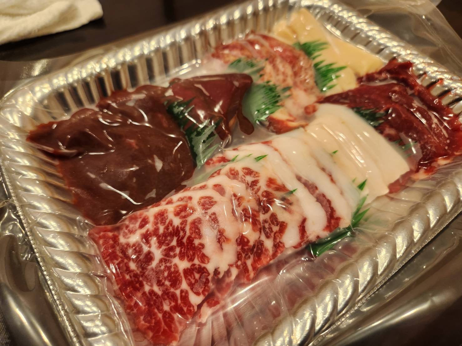 □内容量:赤身20g、たてがみ10g、レバー20g、霜降り20g、フタエゴ20g、タン20g、ハツ20g、心根20g +専用さしみ醤油